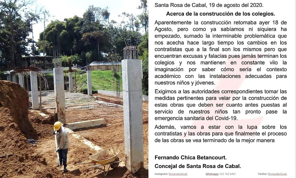Lo por ahora cierto, es que solo hay excusas a todos los niveles para no arrancar las obras. Cabe recordar que muchas de estas construcciones de colegios fracasaron tras el incumplimiento de los contratos por parte de constructoras como Mota-Engil y otras (https://bit.ly/3lbgFj4). Problema que tuvo su capítulo en Risaralda y Santa Rosa, y que bien denunció el cabildante antes de ser elegido y cuya bandera hoy sigue sosteniendo.